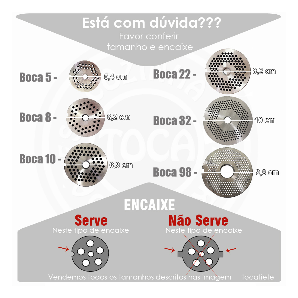 - Caso seu moedor de carne não seja da Picelli, por favor, compare as medidas e o formato do encaixe do seu disco na máquina com as da imagem do anúncio.