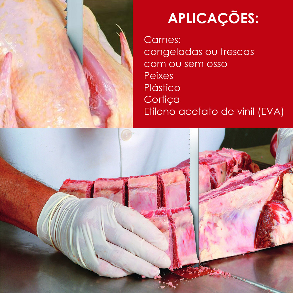 • Grande variedade de modelos para cortes específicos de carne como: charque(carne seca), carne congelada, ossos, peixes, etc.;