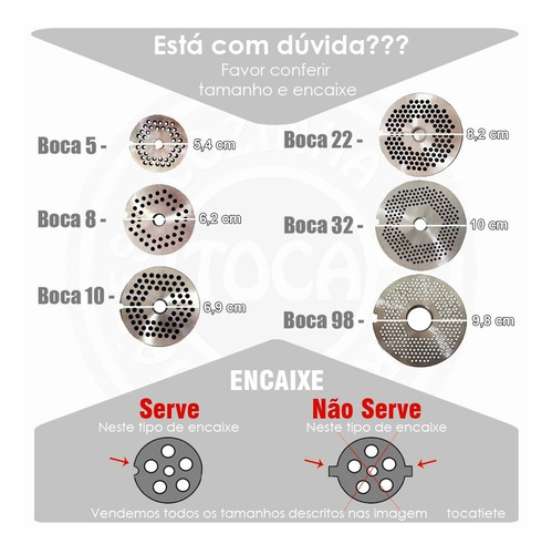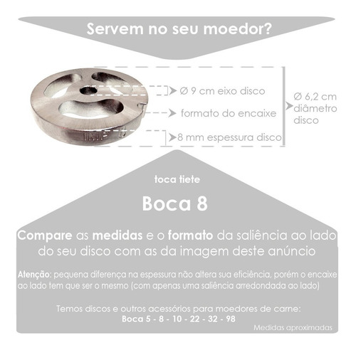 - Caso seu moedor de carne não seja uma dessas marcas citadas acima, por favor, compare as medidas do seu disco com as da imagem do anúncio.