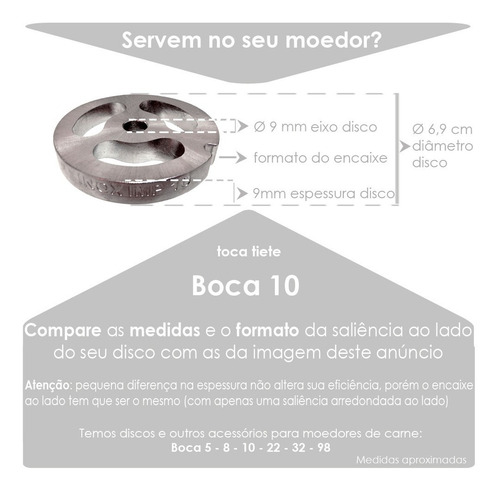 - Caso seu moedor de carne não seja uma dessas marcas citadas acima, por favor, compare as medidas e o encaixe do seu disco com as da imagem do anúncio.